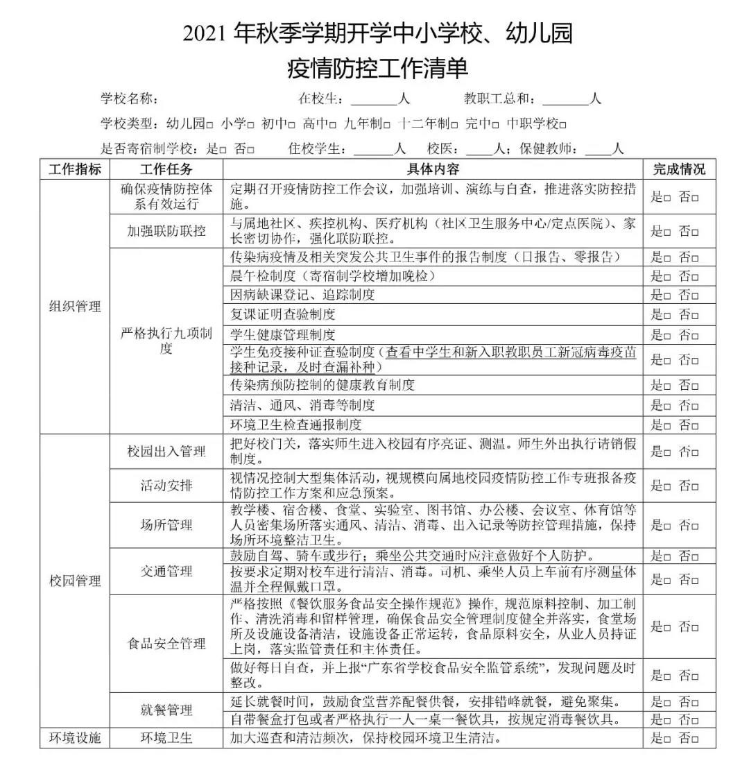 (二)加快完善新学期学校疫情防控工作方案,细化防控工作举措。各地各学校要按照属地政府的统一部署,根据疫情常态化防控要求,按照“一地一策”“一校一策”,重点人员“错区域、错层次、错时、错峰”返校等原则,制订、细化开学师生返校安排、疫情防控准备等工作方案,重点制定有针对性、可操作性的学校大规模核酸检测工作方案和学校封闭封控管理工作方案,将开学工作与新冠病毒疫苗接种、疫情防控等统筹考虑。在总结前期防控工作经验的基础上,对照《广东省2021年秋季学期开学学校疫情防控工作清单》,调整疫情防控机制和策略,既要严格落实常态化疫情防控措施,又不能层层加码设卡,新政策制定后应加强与师生和家长的沟通解释,取得理解和配合。