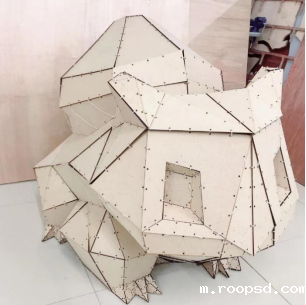 作品以宝可梦中的角色杰尼龟为创造原型,以密度板为主要材料。根据动画中的角色形象进行建模,将模型导入特殊的切片软件,设置好碎片大小、接口卡口等参数后导出碎片图纸,根据图纸用激光机切割密度板得到碎片,用扎带把密度板碎片拼装完成。最后借助激光雕刻机和建模软件的叠加应用,把屏幕上的角色转换为现实呈现的立体形象。