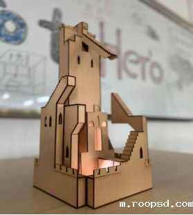 设计者利用软件进行模型设计及简易的木板材料进行激光切割,碰撞出充满格调和韵味的建筑设计灵感。建筑上采用锥塔形和半圆形作为建筑的窗口,城墙上的台阶走势怪诞,整体显得天马行空,从不同方向观察,会获得不一样的体验。该作品采用了激光雕刻切割技术,利用输出不同的功率和调整不同的切割技术来渲染黑色的轮廓和雕刻城墙上的花纹。