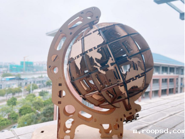 地球仪是人类文明和科技的见证之一,该作品借助简单的密度板展现了一个与众不同的地球仪。地球仪主体采用镂空设计,内部采用数十根龙骨相连,而龙骨也巧妙地化身为地球仪的经纬线。地球仪表面的小木块使用激光雕刻机切割制作而成,细致展现了七大洲的大致轮廓,而地球仪表面的镂空部分则为海洋。中轴和底座的配合使用帮助地球仪实现转动。