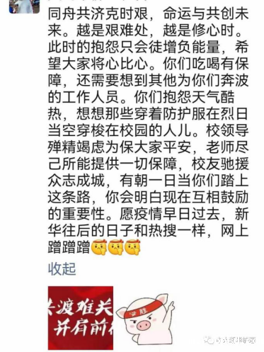 “我们现在可能物资供给没有那么及时,但是现在是艰难时刻,危急关头,我们护理学院的同学们要把感恩之心和同理之心发扬下去。有困难我们及时反映,但是我们要坚定不移地执行学校的各项安排,坚持做好一切防疫措施,曙光就在前面。”王秀岚鼓励学院师生。