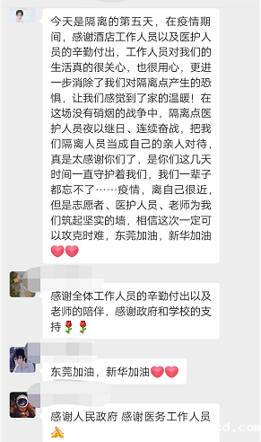 在东莞的一处校外隔离点共接收了我校东莞校区部分隔离学生。为了保障该校外隔离学生的身心健康,由伟德app入口陈昌老师、余小燕老师、蔡宜君老师、黄廷芬老师和何洁凝老师组成的了“bv伟德体育app官网学院抗疫工作小组”集中对该校外隔离点的学生进行安全陪护和心理疏导。